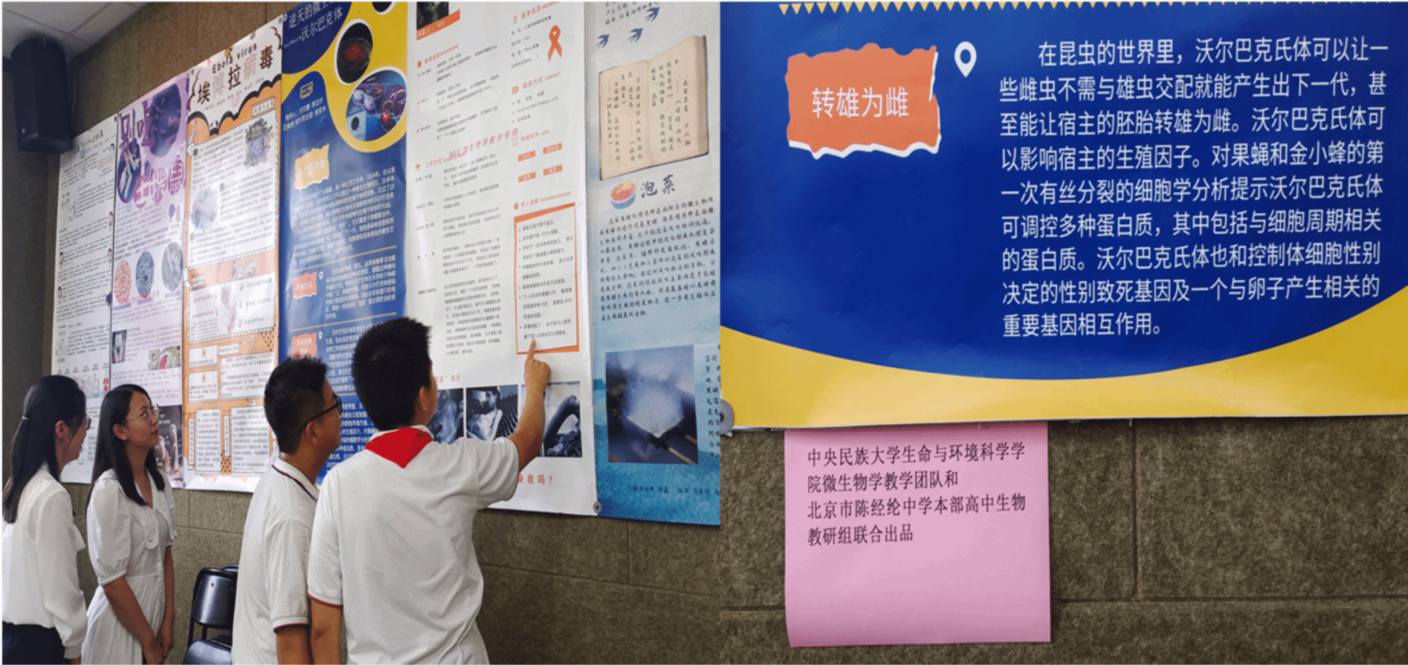 课程团队继续扩大推广范围,于今年开始与北京陈经纶中学进行合作。除常规校内海报展览外,2023年6月16日,在陈经纶中学教育集团崇实分校学苑校区召开的北京市生物学科“探究实践”活动现场会中,爱情岛论坛