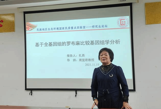 2020级民族生态学专业博士研究生扎西同学以《基于全基因组的罗布麻比较基因组学分析》为题与师生们进行了分享。他的报告内容主要包括:1.人类基因组的发展及意义;2.植物基因组能解决哪些问题;3.对罗布麻全基因组的测序、组装和预测的结构;4.对物种演化的分析以及比较基因组学分析;5.罗布麻基因组分析的结论及进行基因组分析时需要注意的问题。在报告后的交流互动环节,同学们踊跃提问,积极参与讨论,学术氛围浓厚。