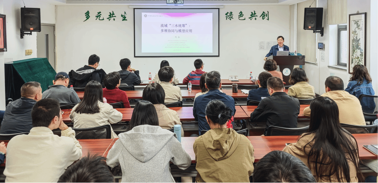 讲座伊始,张严教授代表学院热烈欢迎刘永教授及其团队,简要介绍了刘永教授的研究方向与学术成就。刘永教授系统阐释了"三水统筹"治理理念的创新内涵,强调水资源、水环境与水生态并非孤立要素,而应通过跨尺度、多目标的系统治理实现协同增效。他重点介绍了由北京大学生态环境部河流全物质通量重点实验室研发的WatSim模型体系,该体系已在滇池、洱海等湖泊治理中取得重要应用成果。针对当前模型存在的不足,刘永教授提出"机理+数据"双轮驱动的发展路径,希望加强环境模型标准化与数据共享,打破学科壁垒,促进生物、化学、环境科学与人工智能的深度融合,构建可解释、可验证的基础性模型。