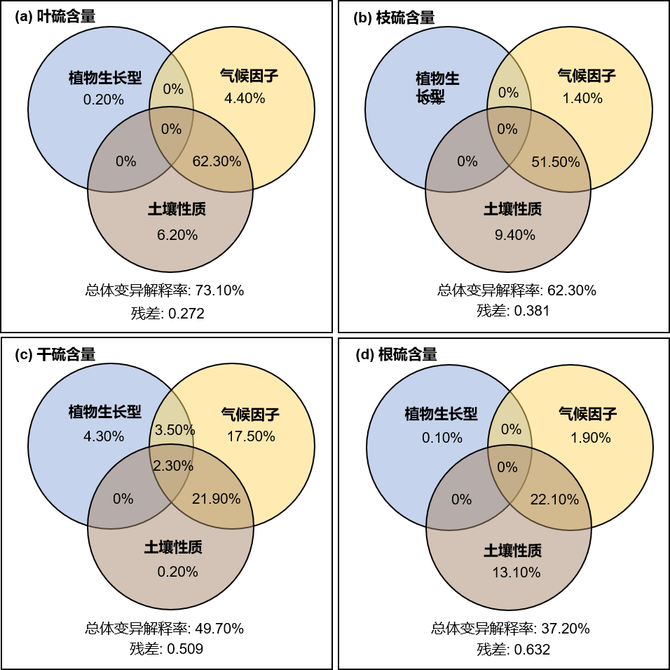 基于以上问题和假设,研究团队对中国78个典型群落中的2745种植物进行了实地调查,构建了一个包含叶、枝、干和根S含量的匹配的数据库。结果表明,中国植物叶、枝、干和根中S的平均含量分别为2.32±0.04、1.13±0.02、0.15±0.01和1.23±0.02 g kg–1。植物中代谢较活跃的器官,如叶片中的S含量显著高于其他器官;而沙漠植物中的S含量高于其在森林和草原植物中的平均水平(图2和3)。另外,研究发现根中S含量变化较其他器官快,在一定程度上反映了在资源有限的情况下根系对S的富集和积累效应更强,与器官的功能密切相关;且不同器官间S的分配关系因尺度大小而异(生态系统、植物生长型等),并不是严格保守的。气候因子和土壤性质因子是调控S在不同器官间的空间变异和分配的主要环境因子,而植物生长型对S变异的影响较弱(图4)。研究结果进一步拓宽了我们对S的生物学功能及其在植物与环境相互作用中的理解,将有助于进一步了解植物的演化和适应机制,及在全球变化背景下的养分利用策略。