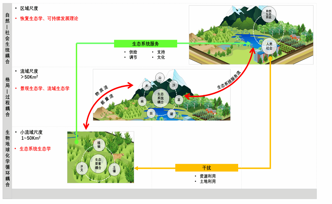 “山水林田湖草沙研究专项”主要以山水林田湖草沙耦合理论基础,从小流域尺度、流域尺度和区域尺度展开,涉及生态系统生态学、景观生态学、流域生态学、恢复生态学和可持续发展生态学。将在明确山水林田湖草沙耦合机制的基础上,研究典型区域生态系统中长期演替规律及稳定性维持机制。
