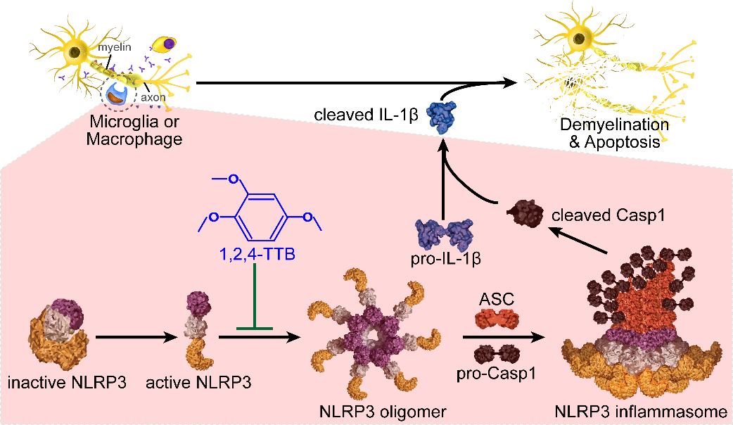 廖亚金博士与江西中医药大学张海燕老师合作,从一组精油单体化合物中筛选得到1,2,4-三甲氧基苯可以特异性抑制NLRP3炎症小体激活。细胞水平研究证实1,2,4-三甲氧基苯特异性抑制NLRP3激活,而对AIM2炎症小体的激活无显著影响。在多发性硬化症的动物模型上的研究成果进一步证实1,2,4-三甲氧基苯可以显著缓解自身免疫导致的脱髓鞘反应和后肢残疾。该抑制剂的发现为靶向NLRP3炎症小体治疗相关疾病提供了候选药物。