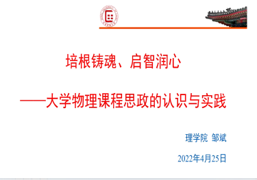 邹斌老师以“培根铸魂、启智润心——大学物理课程思政的认识与实践”为题,从 “为何”与“何为”、大学物理课程思政的实践等方面,结合邹老师申报北京市课程思政示范课程的经验,对为什么要开展课程思政、怎么开展课程思政做了阐述,同时结合具体的《物理学与人类文明》课程,分别选取实验课程“霍尔效应实验”和理论课程“角动量守恒”,从三个层面科学图景的描绘、从学史中汲取养分、应用前景的展望,详细阐述了如何做好课程思政建设、如何挖掘思政元素,邹老师还指出,课程思政建设是非常具有个性化的教学实践,是值得每一位老师深入思考和专研的事业。随后,老师们针对课程思政建设申报、挖掘课程思政着力点、如何撰写《申报书》等多个方面展开了热烈的讨论。