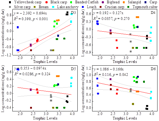 多种环境介质中发现了甲基硅氧烷的普遍存在。然而,关于其生物体累积的信息仍不足,制约了对其生态风险的可靠认识。唐阵武教授团队研究了甲基硅氧烷在典型淡水湖泊(巢湖)水生生物中存在和组织分配,并基于稳定同位素确定生物体营养级,研究了这类化合物在湖泊食物网的营养级迁移行为,发现D3具有生物放大现象,首次报道了甲基硅氧烷在鱼体的组织分配。研究结果为进一步了解这些化合物在野生鱼类体内的药代动力学以及在水生食物网的营养动力学提供了重要信息。唐阵武教授团队研究了甲基硅氧烷在农村工业区周边散养家鸡/鸭的卵中的存在、分配和主要来源,并基于家禽和野生鸟类生理和摄食生态的相似性,提出了甲基硅氧烷污染对野生鸟类子代的潜在风险,首次报道了甲基硅氧烷在禽蛋的分布以及在蛋清、蛋黄的分配。研究结果为甲基硅氧烷的风险评估和风险管理提供了科学依据。