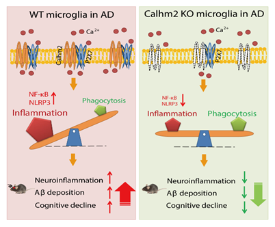 近年来,钙稳态调节蛋白在AD中的作用受到越来越多的关注,其中钙稳态调节蛋白Calhm2的蛋白结构已被解析(Nature, 2019),但其在体的生理功能尚不清楚。在本研究中,发现钙稳态调节蛋白Calhm2在临床AD患者以及AD动物模型小鼠中显著上升;进一步利用Calhm2全身敲除小鼠(Calhm2 KO)、神经元条件性Calhm2敲除小鼠(Calhm2flox/flox;CamKIIα-iCre)、小胶质细胞条件性Calhm2敲除小鼠(Calhm2flox/flox:Cx3cr1-CreER),结合AD动物模型 (5×FAD),明确了小胶质细胞中Calhm2缺失显著降低小鼠脑内Aβ沉积以及神经炎症水平,显著改善AD模型小鼠的认知障碍;通过微量基因组学、细胞膜离子通道检测、钙信号检测、免疫组织化学等方法,发现Calhm2敲除显著降低了小胶质细胞的炎症激活能力,增加了其吞噬能力;这一过程与Calhm2调控小胶质细胞内的钙内流以及P2X7的功能密切相关(下图)。
