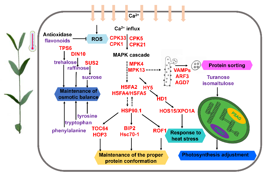 研究发现,西蒙得木通过调节蛋白质折叠、蛋白分选、光合作用、钙信号通路、MAPK级联、自由基清除、能量代谢和碳水化合物代谢等过程适应高温胁迫。通过钙离子和MAPK信号通路激活下游转录因子HY5和HSF进而诱导了热激应答基因的表达。如HSP90,mtHSC70-1和mtHSC70-2可能在维持高温胁迫西蒙得木叶绿体、线粒体以及转录和翻译装置的正常功能中发挥重要作用。还有一些编码与能量代谢和光合作用相关酶的基因在高温胁迫下也发生了差异表达,这有助于重建西蒙得木体内被破坏的能量平衡。此外西蒙得木还通过调节碳水化合物和氨基酸代谢途径来维持渗透平衡,减轻高温胁迫造成的损害,一些可溶性糖和游离的氨基酸(如半乳糖醇、蜜二糖、蔗糖、脯氨酸、色氨酸、苯丙氨酸等)含量上升(图1)。研究结果有助于理解耐热植物热适应的分子机制,鉴定的关键耐热基因也可以作为作物耐热育种的候选基因。