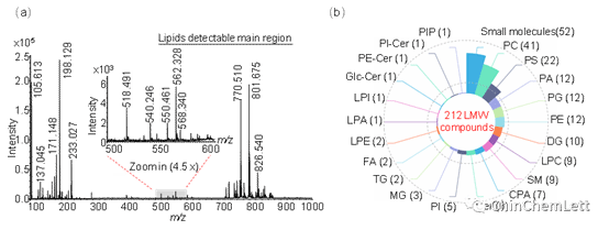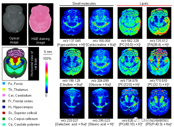 图2. 4-NC作为MALDI基质用于小鼠脑组织切片内源性小分子和脂质分子质谱成像
