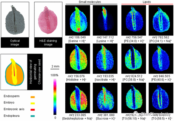 图4. 4-NC作为MALDI基质用于红豆杉种子组织切片内源性小分子和脂质分子质谱成像